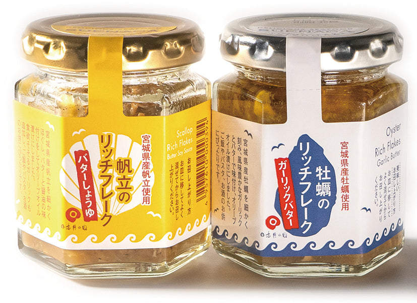 牡蠣を細かく刻み、風味豊かなガーリックとこくまろバターで味付けしました。アクセントに唐辛子をいれ、オリーブオイルに漬けています。牡蠣の濃厚な旨味と絶妙な塩味です。帆立のリッチフレークは帆立を醤油とバターで味付しガーリックとオリーブオイルで漬けました。ごはんに載せても、パンやパスタと合わせても美味しくお召し上がり頂けます。ちょっとしたプレゼントにも○。